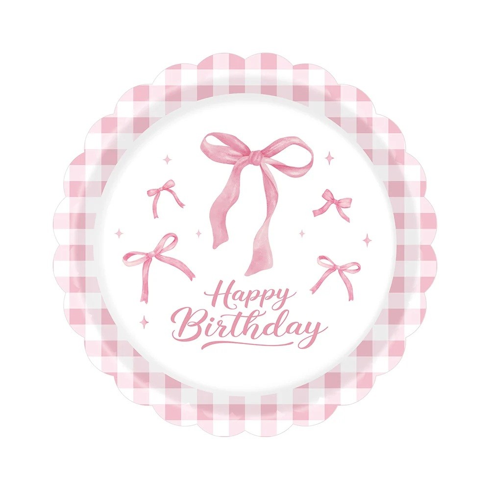 10 pcs Assiettes en papier d'anniversaire 22,9 cm Joyeux Anniversaire Noeuds roses avec bordure à carreaux Assiettes de fête jetables