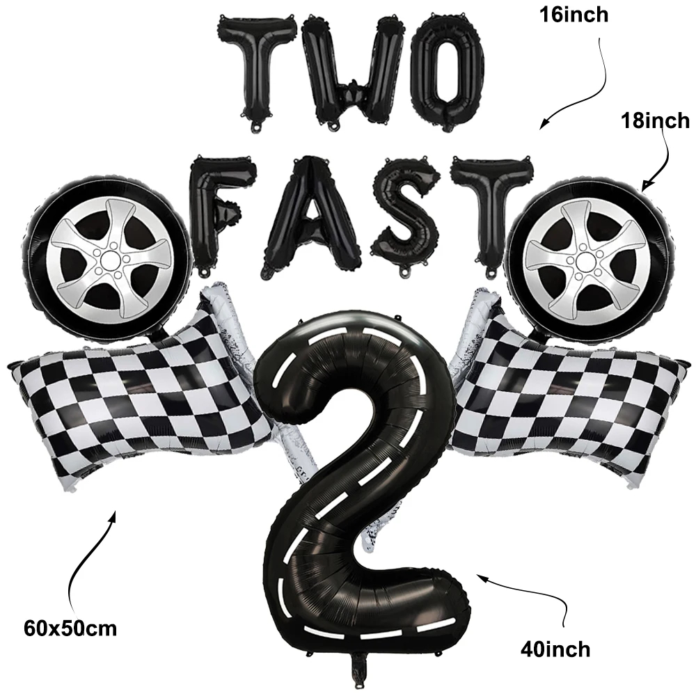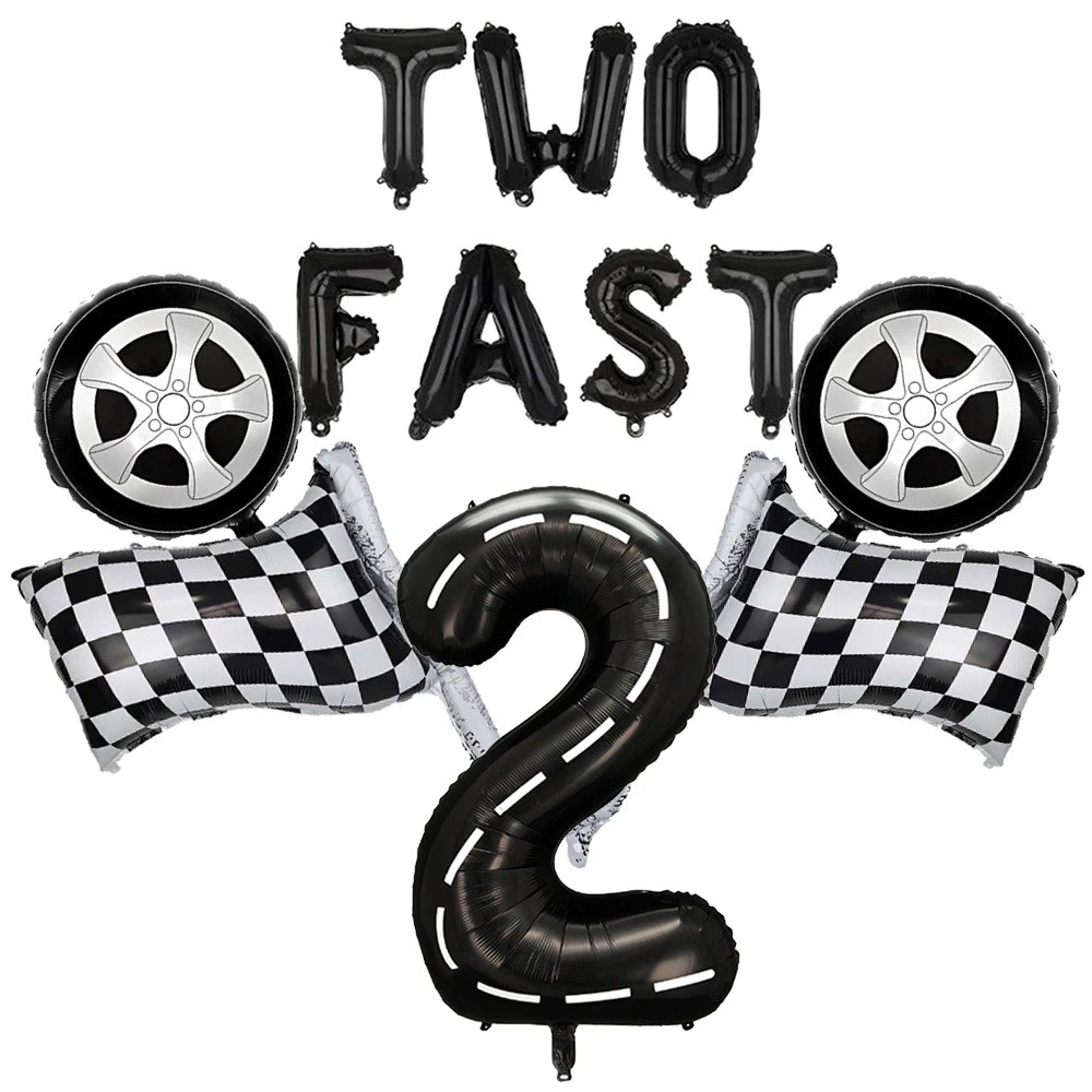12 pcs Ballons en Folie Thème de Course Two Fast Numéro 2 Pneus et Drapeaux de Course Décoration pour Anniversaire d'Enfant
