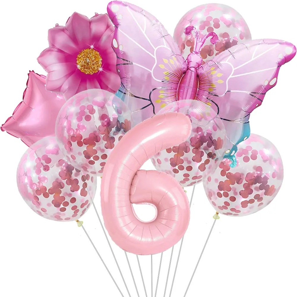 9 pcs Ballons d'anniversaire numéro 6 Papillon fleur Confettis Ballons en latex et en foil Décorations de fête pour le sixième anniversaire fête d'enfants