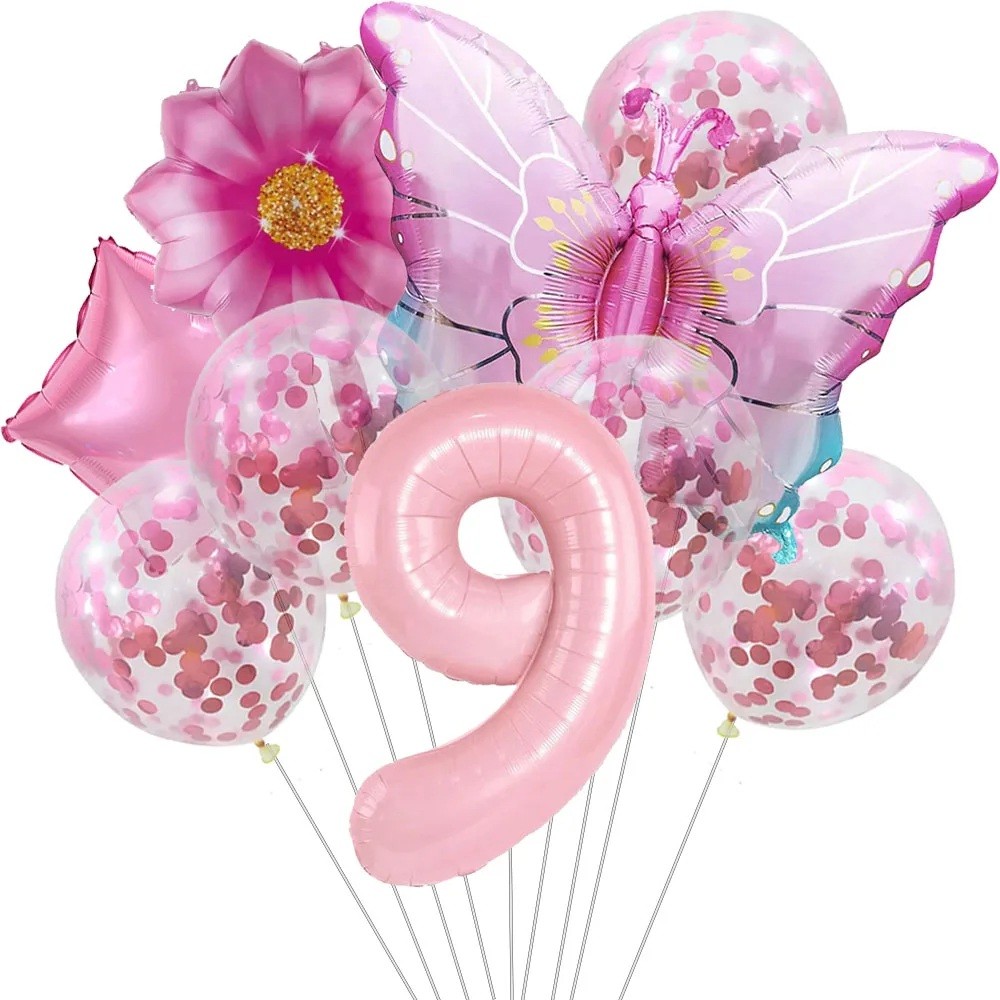 9 pcs Ballons d'anniversaire numéro 9 Papillon fleur Confettis Ballons en latex et en foil Décorations d'anniversaire décoration de fête d'enfants