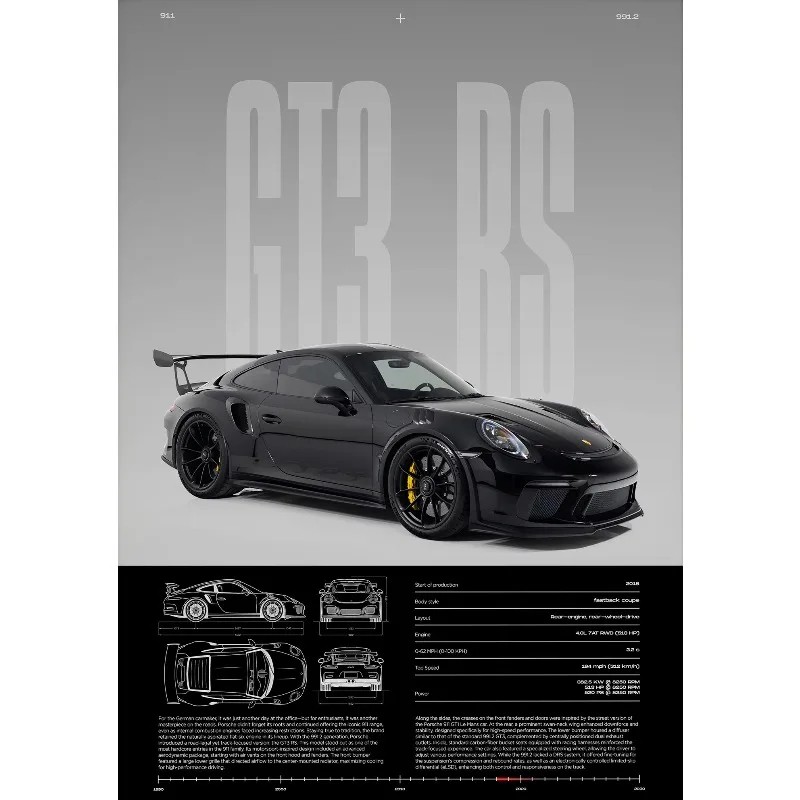 Affiche avec le motif GT3-RS accompagnée de dessins techniques, idéale comme élément stylé dans un intérieur moderne, un bureau ou un cabinet. Description complète
