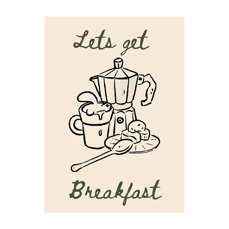 Page d’accueil Page d’accueil Maison et intérieur Décorations et accessoires d'intérieur Cadres et tableaux Affiche murale motif petit déjeuner Let's get breakfast avec cafetière moka 30 × 42 cm impression sur toile décoration beige pour la cuisine et le café sans cadre