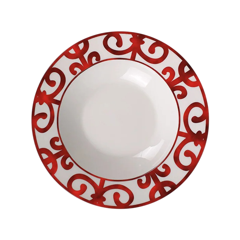 Le design de l'assiette se caractérise par un motif ornemental principalement situé sur ses bords. Le centre de l'assiette reste propre et sans décor, créant un contraste entre la surface simple et le bord richement décoré. L'ornement est composé de lignes courbes et de formes répétées, qui sont à la fois décoratives et claires.