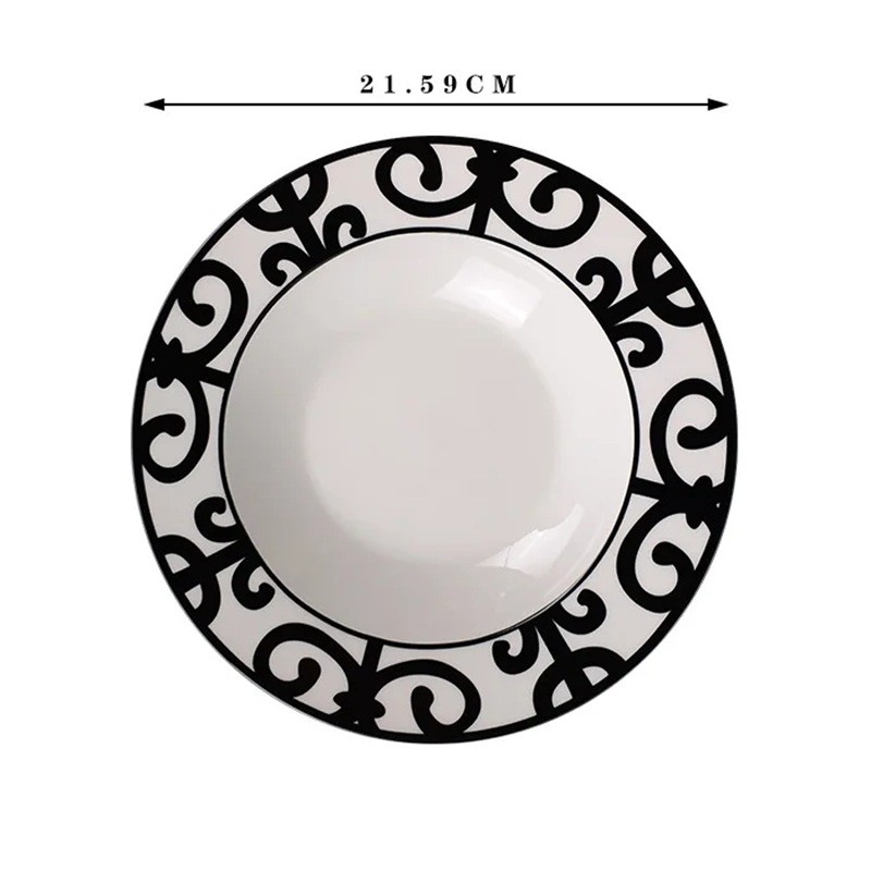 Assiette en céramique de 21,59 cm avec motif ornemental sur le bord est idéale pour le service des plats et des desserts lors des repas quotidiens. Description complète