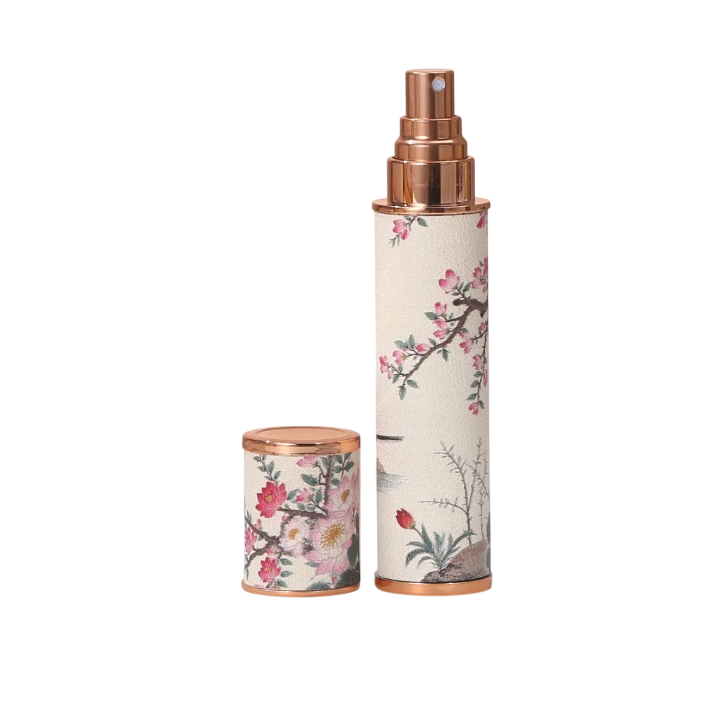 Atomiseur de parfum compact de 10 ml avec motif décoratif de fleurs et d'oiseaux. Taille pratique pour un transport facile dans un sac à main. Description complète