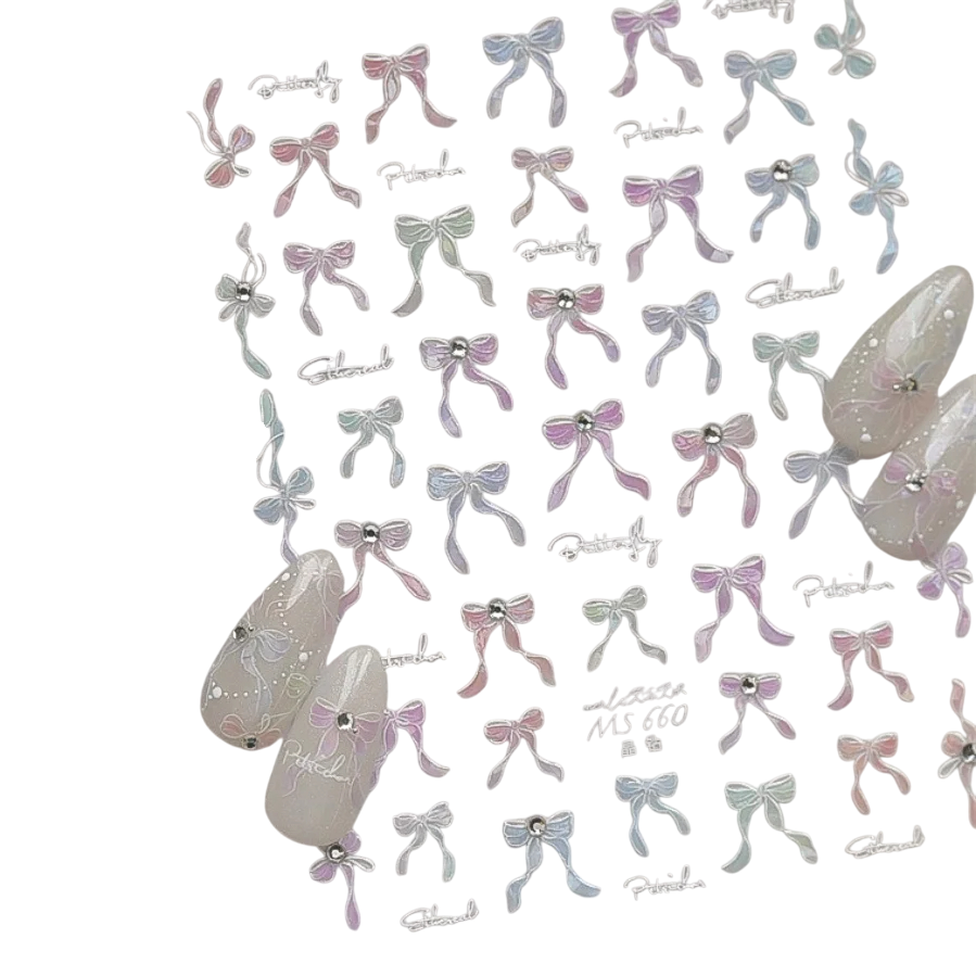 Autocollants 3D pastel avec des nœuds pour un nail art délicat et élégant. Application facile, longue tenue et utilisation universelle pour un look quotidien ou festif. Description complète