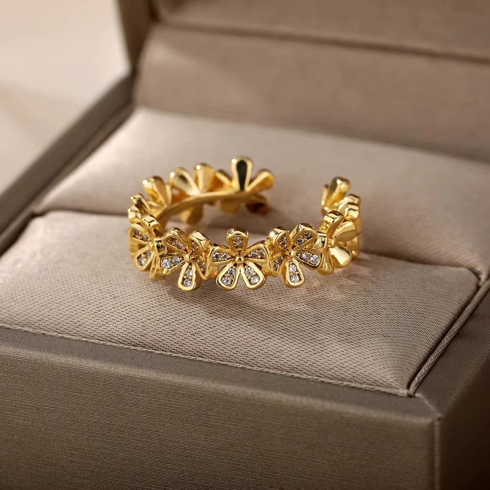 Bague décorative avec motif floral et pierres brillantes en acier inoxydable résistant de couleur dorée, ajustable pour un port confortable au quotidien. Description complète