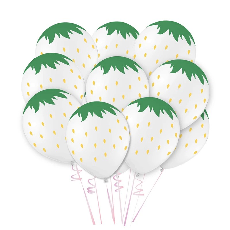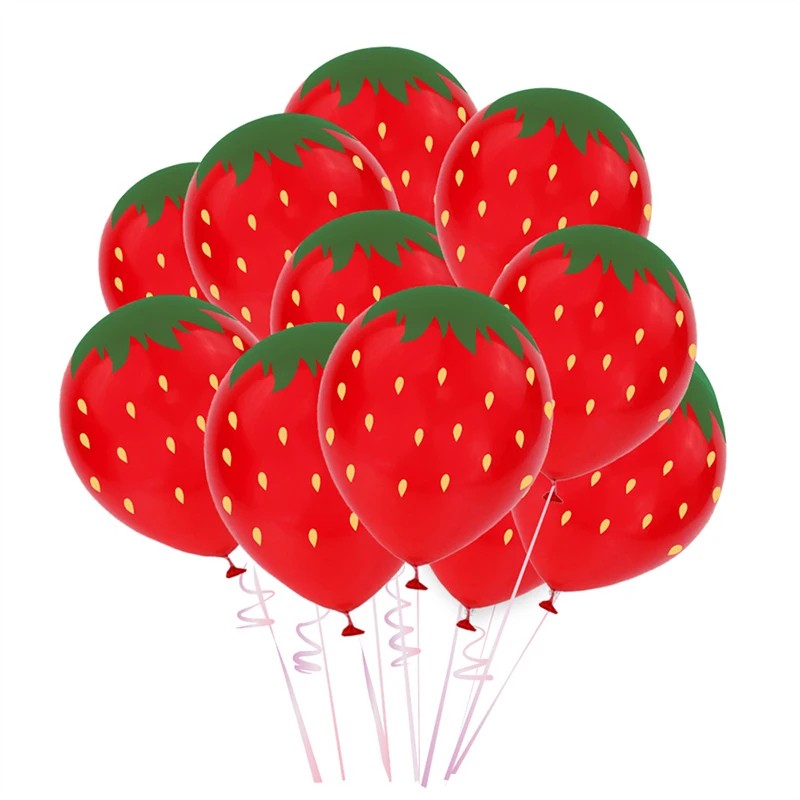 La surface des ballons est ornée d'un motif décoratif de fruits, rappelant les fraises. Ce design peut attirer l'attention et donner à la décoration un aspect ludique et thématique. Les ballons peuvent être utilisés par exemple comme partie de la décoration dans une pièce ou comme complément à un arrangement festif.