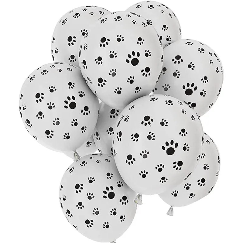 Les ballons sont de couleur blanche et sont décorés d'un petit motif noir de pattes. Cette impression crée un aspect thématique, qui peut être approprié par exemple pour des célébrations avec un motif animal ou pour la décoration d'anniversaires d'enfants.