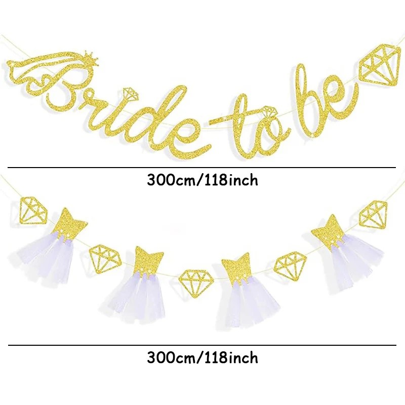 Cette bannière en papier scintillante avec l'inscription Bride To Be est une décoration marquante pour un enterrement de vie de jeune fille ou une célébration de mariage. L'inscription „Bride To Be“ signifie „Future mariée“ et met magnifiquement en valeur le rôle principal de la personne célébrée. La guirlande comprend également des éléments décoratifs en forme de diamants et de robes, qui apportent une touche délicate et festive à l'ensemble de la décoration. L'effet scintillant argenté brille magnifiquement à la lumière et apparaît élégamment sur les photos.