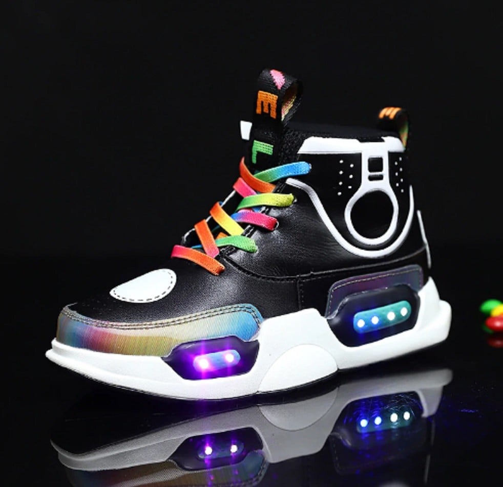 Les chaussures ont des lumières LED dans la semelle, qui se chargent via USB.