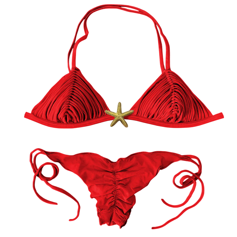 Bikini original avec un top à franges, décoration étoile de mer et culottes tanga à nouer sur les côtés pour des journées estivales élégantes à la plage. Description complète