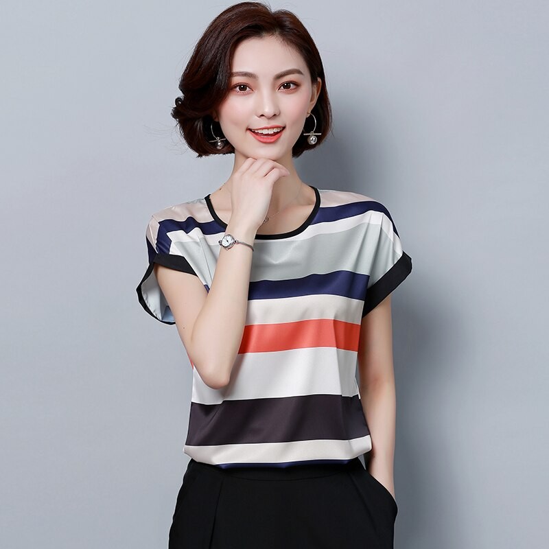 Elle a des manches courtes et un imprimé de rayures colorées.