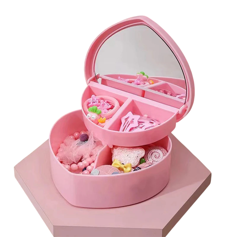 La boîte à bijoux pour fille en forme de cœur est un organisateur pratique destiné au rangement de petits bijoux et accessoires. Grâce à ses dimensions compactes, elle convient à une table d'enfant, une étagère ou une commode, où elle aide à garder les petits bijoux bien rangés.