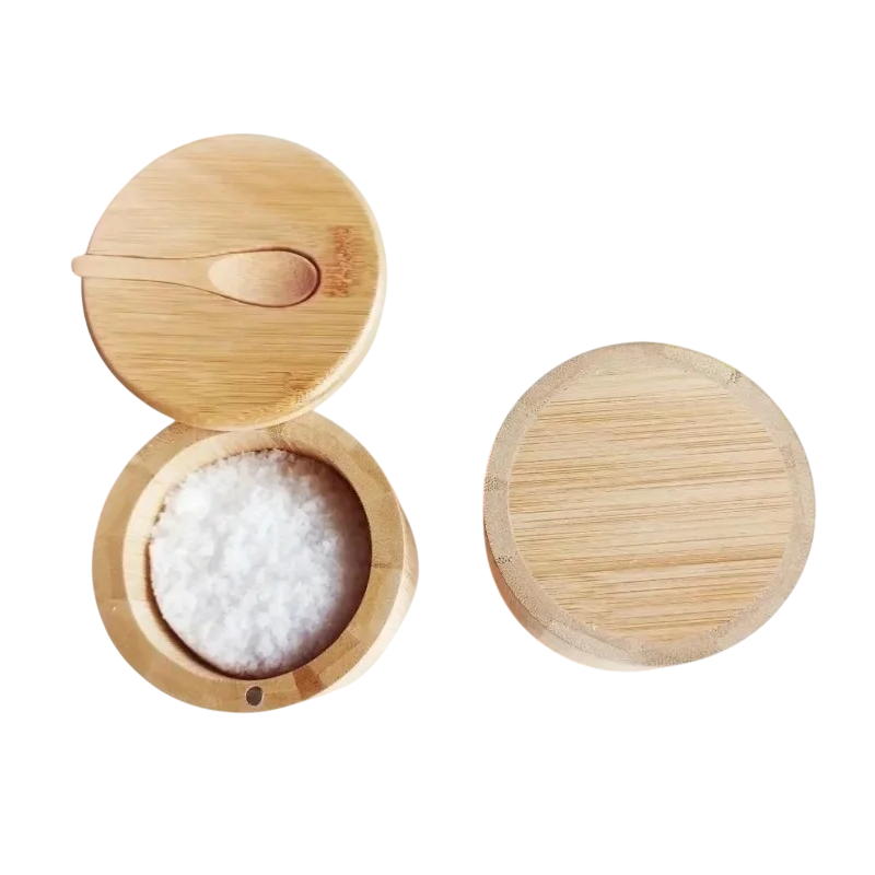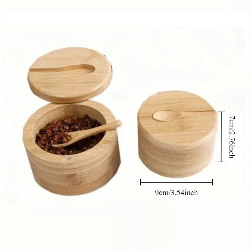 Boîte à épices en bois de 9 × 7 cm avec couvercle et petite cuillère, idéale pour le stockage du sel et des épices en cuisine. Description complète