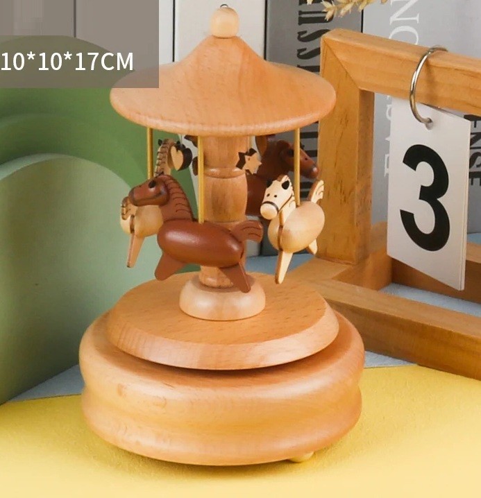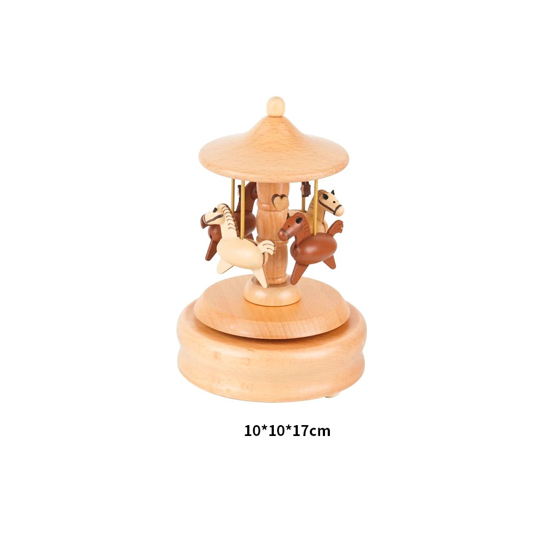 Boîte à musique en bois tournante carrousel chevaux mécanisme manuel 10 × 10 × 17 cm décoration naturelle chambre d'enfant