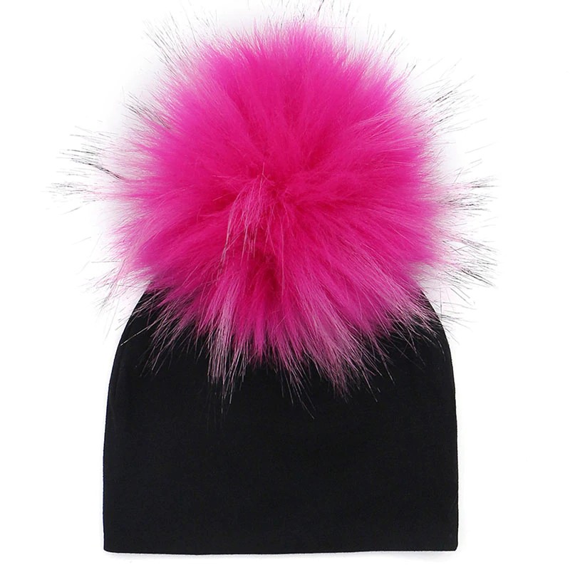 Ce bonnet d'hiver de couleur noire avec des pompons colorés garde agréablement au chaud.