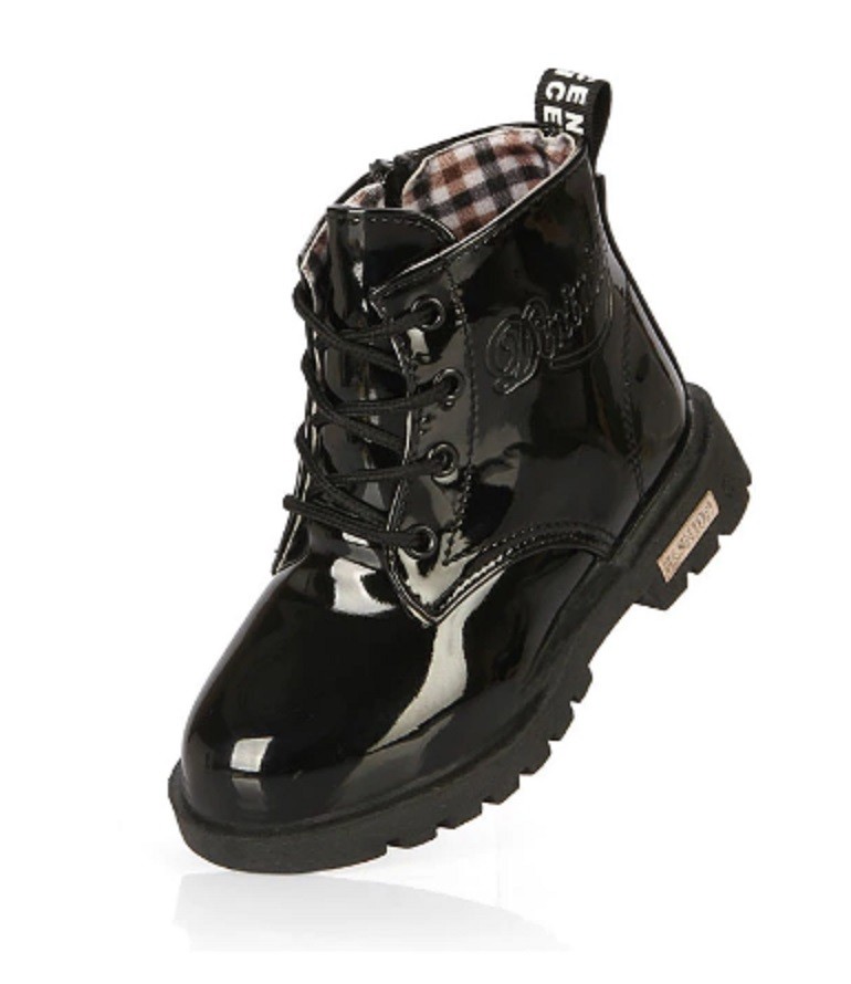 Les bottes sont vernies et se ferment avec des lacets.