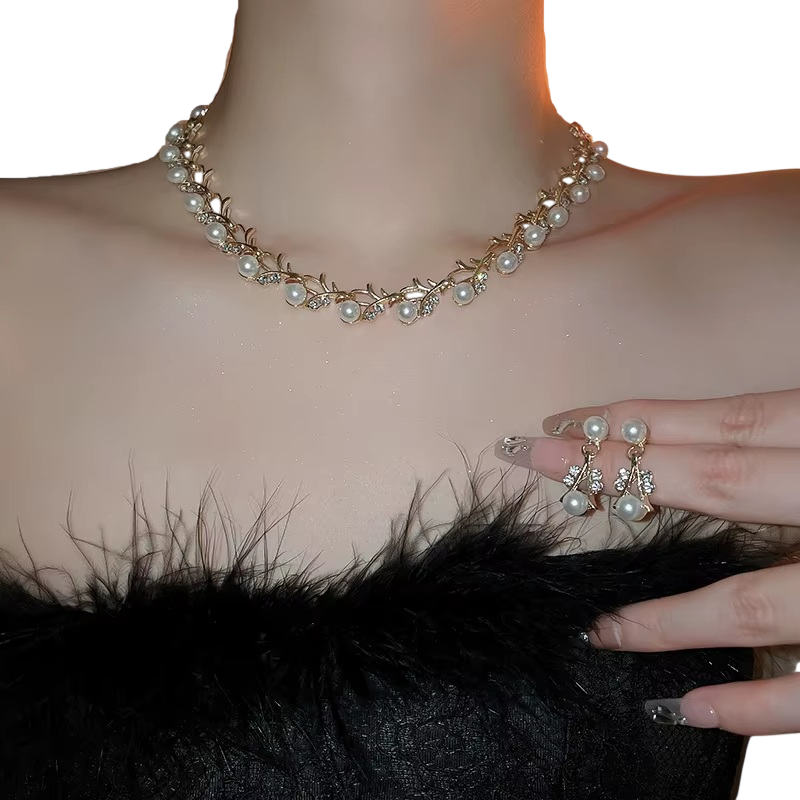 Cet ensemble élégant de collier et de boucles d'oreilles représente une harmonie entre délicatesse et style sophistiqué. Les éléments en perles confèrent aux bijoux un aspect intemporel qui souligne la féminité à chaque occasion. Grâce à sa construction légère, l'ensemble se porte confortablement toute la journée, même lors d'événements en soirée. La base est en alliage de cuivre, qui assure solidité et stabilité tout en conservant un poids agréable. Cet ensemble de perles pour femmes est le choix idéal pour les mariages, les célébrations et les événements sociaux formels.