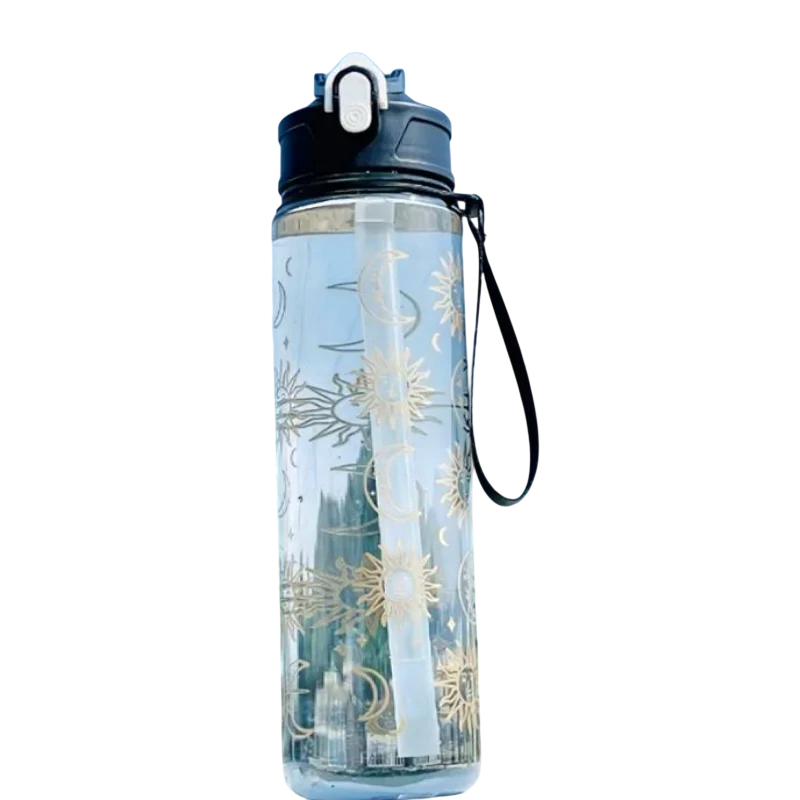 Bouteille en plastique à boire avec paille 800 ml Bouteille noire avec motif soleil et lune bouteille de sport en plastique pour un usage quotidien