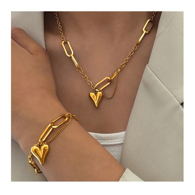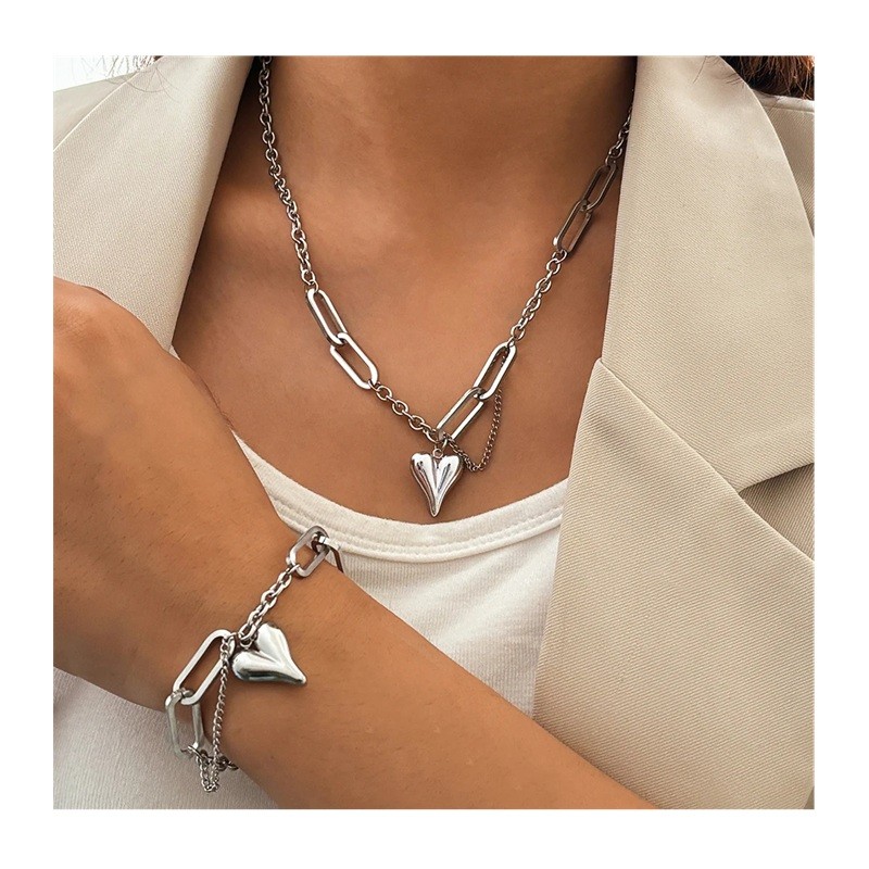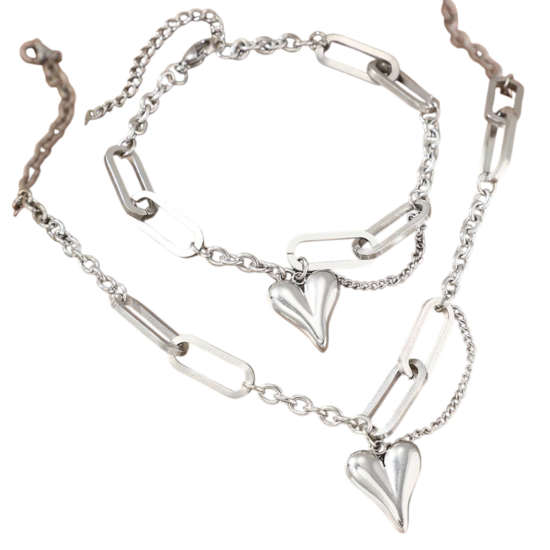 Ce bel ensemble allie minimalisme moderne à une touche rétro et un motif romantique en forme de cœur. Les maillons irréguliers de la chaîne donnent aux bijoux un aspect original qui attire le regard dès le premier coup d'œil tout en restant délicat et élégant. Grâce à sa fabrication de qualité en acier inoxydable, cet ensemble est adapté pour un usage quotidien ainsi que pour des occasions spéciales. La combinaison du collier et du bracelet crée un tout harmonieux qui s'associe facilement à des tenues décontractées ou élégantes. Cet ensemble de bijoux pour femmes en acier inoxydable est un excellent choix pour les femmes qui aiment les accessoires à la fois stylés et pratiques.
