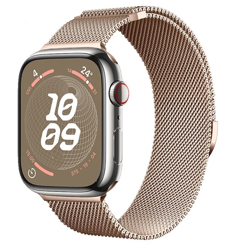Bracelet milanais en métal avec fermeture magnétique et réglage de longueur continu. Conçu pour les Apple Watch Series 10 et 11 en taille 42 mm. Description complète