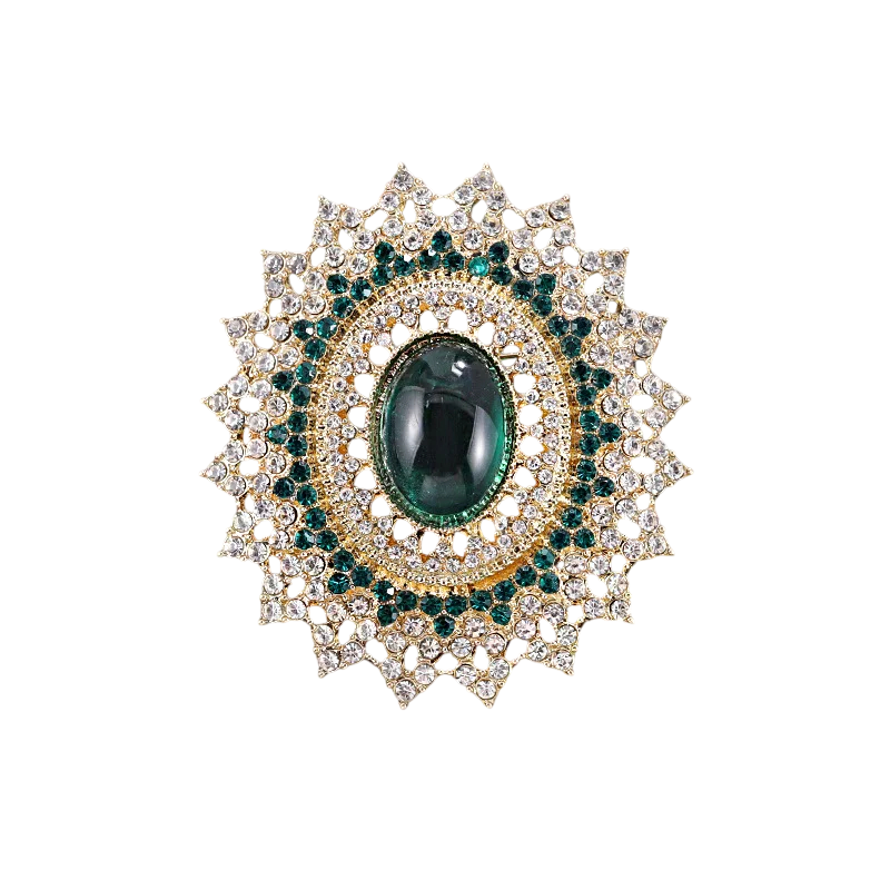 Cette broche de mode luxueuse se distingue par sa forme ornementale en amande, agrémentée d'un motif détaillé de rosette étoilée. La teinte or-vert est à la fois élégante, harmonieuse et très représentative. La broche est conçue comme un accessoire marquant mais toujours discret, capable de souligner le style personnel de la porteuse. Grâce à son design réfléchi, elle s'adapte aussi bien aux tenues élégantes qu'aux tenues plus simples. Elle dégage une allure intemporelle et luxueuse sans ostentation excessive.