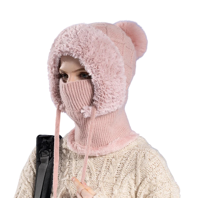 Cagoule d'hiver pour femmes avec pompon et cordons réchauffe la tête et le cou, s'ajuste bien grâce à la circonférence réglable et convient pour un usage quotidien par temps froid. Description complète