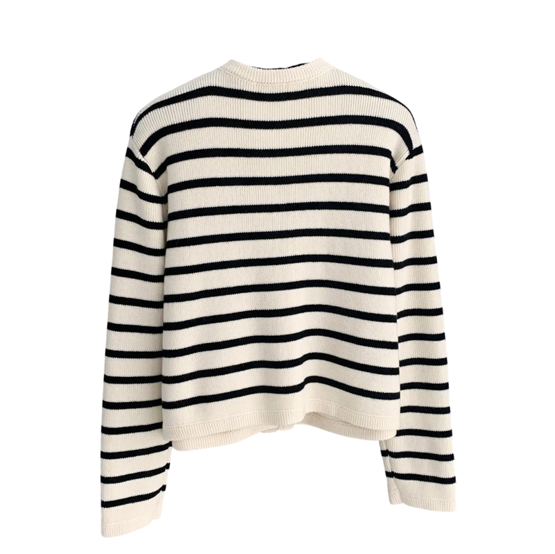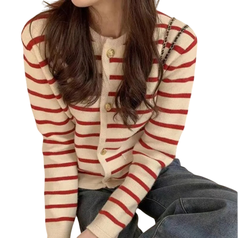 Cardigan rayé pour femmes en polyester avec décolleté rond Pull en tricot élégant avec boutons et manches longues Taille universelle