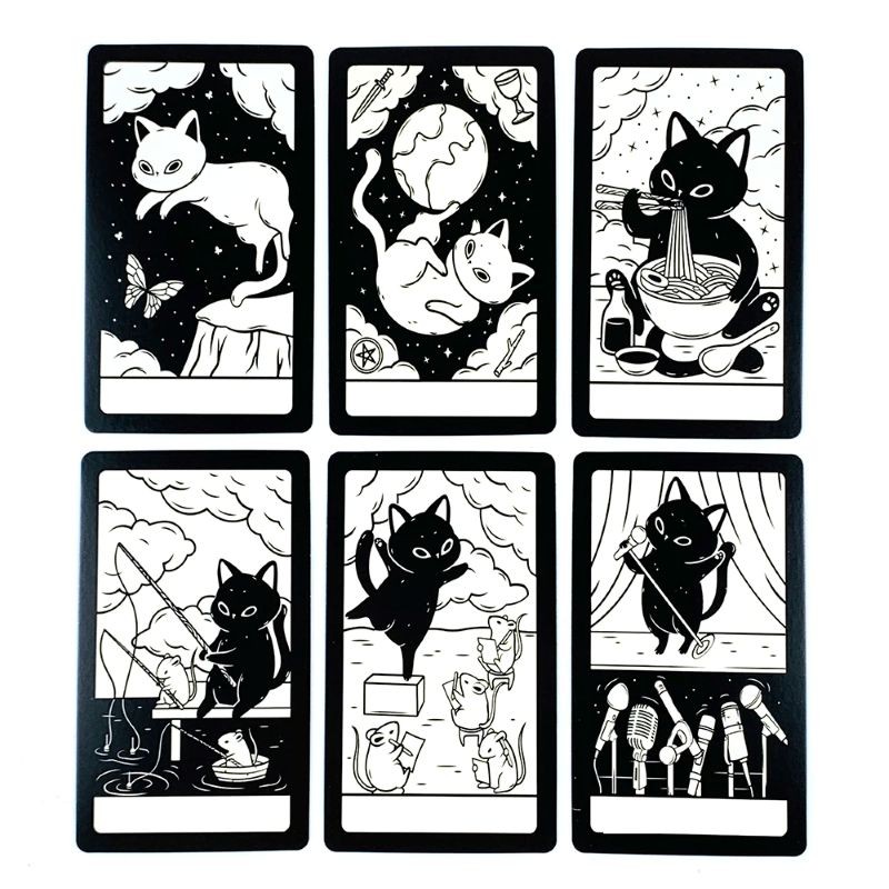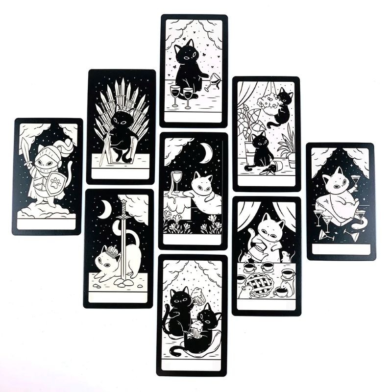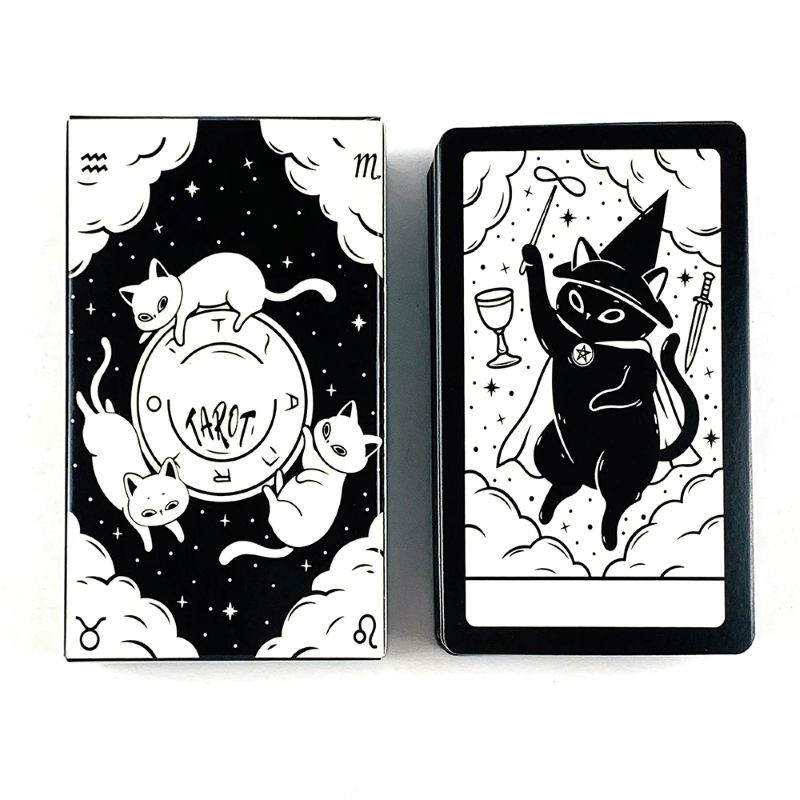 Cartes de tarot divinatoires avec un motif de chatons dans un style noir et blanc. Dimensions compactes et illustrations simples adaptées à la lecture et au jeu. Description complète