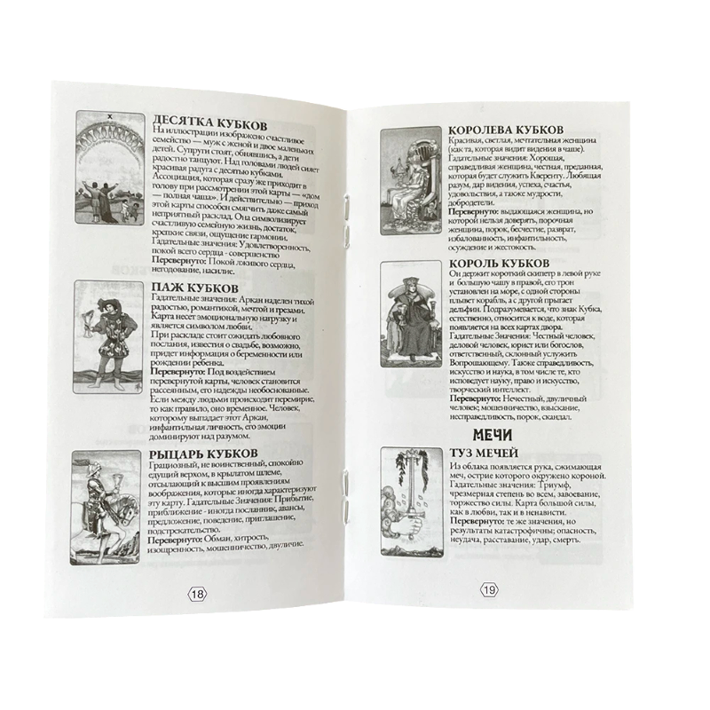 La taille de chaque carte est d'environ 12 x 7 cm, ce qui offre suffisamment d'espace pour des illustrations détaillées tout en permettant une manipulation confortable lors du mélange et de l'étalement. Le paquet contient au total 78 cartes, qui correspondent à la structure standard du système de tarot. L'édition russe des cartes de tarot se distingue par un traitement linguistique et graphique spécifique.
