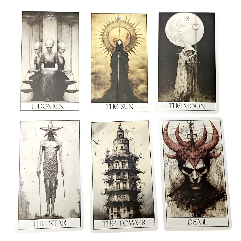 Ce paquet de tarot est conçu dans un style gothique et horrifique, qui se distingue du traitement habituel des cartes de tarot classiques. L'ensemble comprend 78 cartes, qui correspondent au système de tarot standard et permettent leur utilisation dans différentes méthodes de lecture. Les illustrations sont teintées d'une atmosphère plus sombre et travaillent avec des éléments visuels marquants.