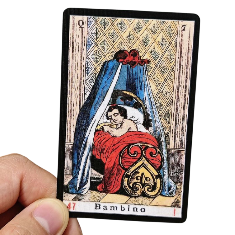 Le jeu contient 52 cartes, qui forment un paquet compact pour un usage quotidien. Le format des cartes permet une manipulation confortable lors du mélange, du déploiement et de la tenue en main. La taille d'environ 9 x 6 cm est pratique pour le transport tout en étant suffisamment grande pour afficher clairement les illustrations.