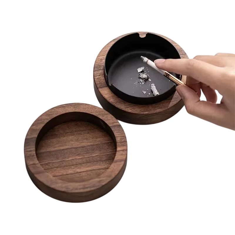 Ce cendrier en bois de noyer allie l'élégance du matériau naturel à un intérieur en acier inoxydable pratique. Grâce à son couvercle, qui minimise la propagation de la fumée et des odeurs, il est idéal pour une utilisation à la maison comme à l'extérieur. Ses dimensions compactes de 10 × 4,5 cm garantissent qu'il s'adapte confortablement sur une table, un balcon ou une terrasse, tout en offrant suffisamment d'espace pour déposer les cendres et les mégots. Le cendrier convient aux cigarettes et cigares, satisfaisant ainsi les divers besoins des fumeurs. Son design élégant en bois de noyer complète parfaitement l'intérieur, tandis que l'insertion en acier inoxydable durable assure un nettoyage facile et une longue durée de vie.
