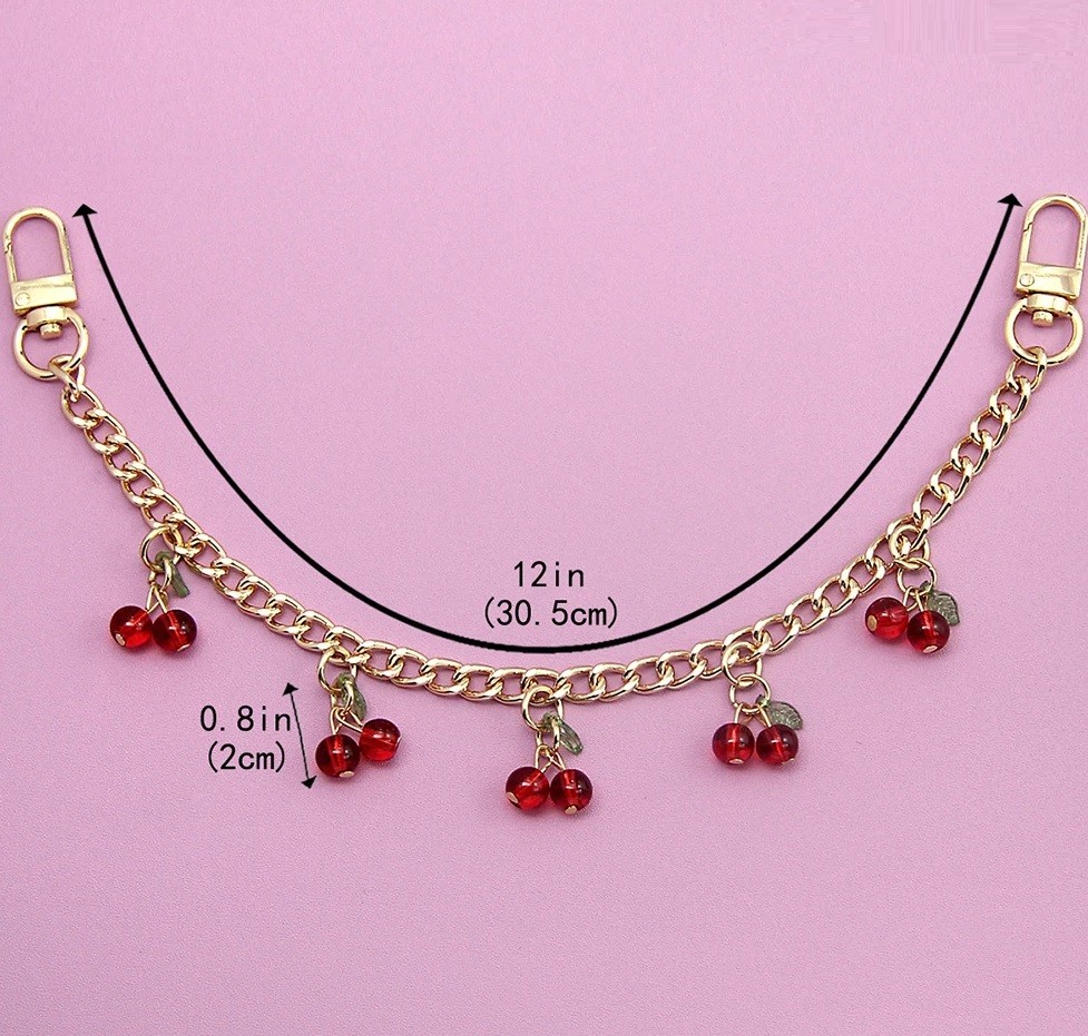 La longueur totale de la chaîne est de 30,5 cm, ce qui la rend principalement adaptée comme anse courte ou élément décoratif sur le sac. Des pendentifs représentant des cerises sont placés sur les maillons métalliques, complétant la chaîne dorée et créant un aspect caractéristique de l'accessoire.