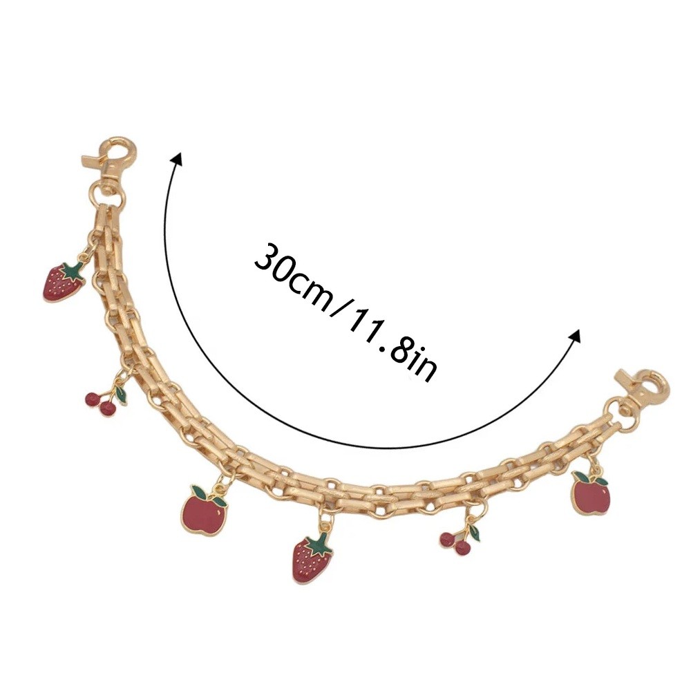 La longueur totale de la chaîne est de 30 cm, ce qui est une taille appropriée pour une poignée courte ou un élément décoratif sur un sac. Sur la chaîne se trouvent des pendentifs représentant des fruits rouges, qui donnent à l'accessoire un aspect caractéristique. La finition dorée s'accorde bien avec différentes couleurs de sacs.