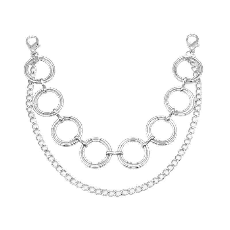 La chaîne a une construction double, composée de deux chaînes reliées à des mousquetons à chaque extrémité. Une chaîne est classique avec des maillons, tandis que l'autre contient de grands anneaux en métal qui créent un design caractéristique et distinguent ce modèle des chaînes ordinaires.