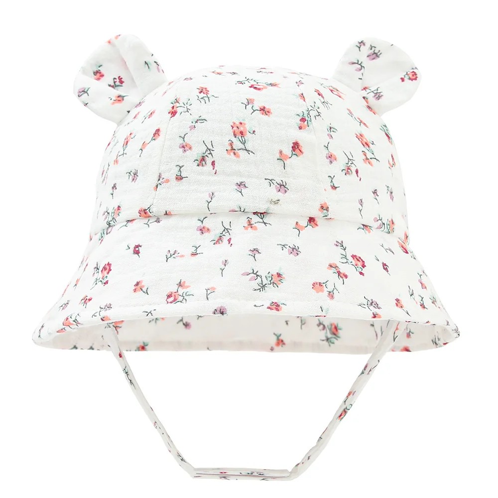 Chapeau d'enfant mignon avec oreilles et motif de petites fleurs roses, idéal pour les bébés lors des journées chaudes. Le chapeau est fabriqué en coton doux et respirant, qui est doux pour la peau sensible des enfants et offre un confort maximal lors du port. Le matériau léger permet la circulation de l'air et aide à prévenir la surchauffe de la tête.