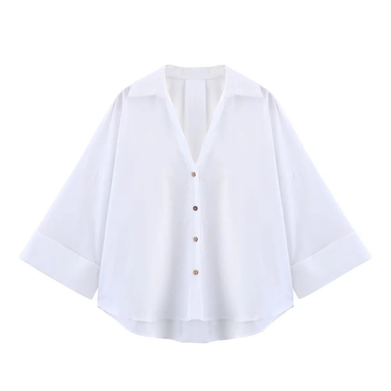 Chemise stylée pour femmes en polyester léger à manches courtes, avec col et boutons. Coupe ample et confortable pour un look élégant ou décontracté. Description complète