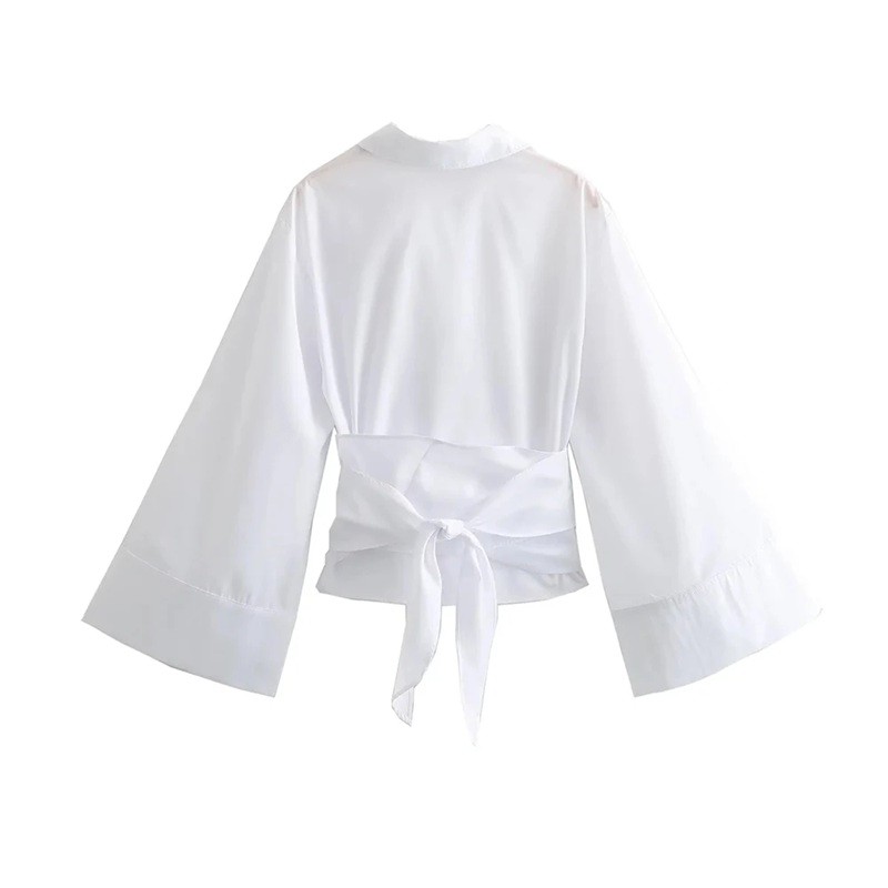 Page d’accueil Page d’accueil Vêtements et accessoires Vêtements et accessoires femme Chemises femme Chemises décontractées femme Chemise élégante pour femmes avec col et manches longues Kimono stylé avec nœud à la taille Blouse unie à boutons en polyester léger