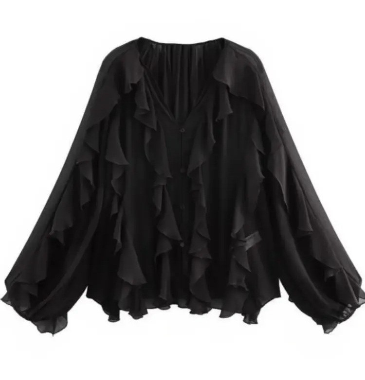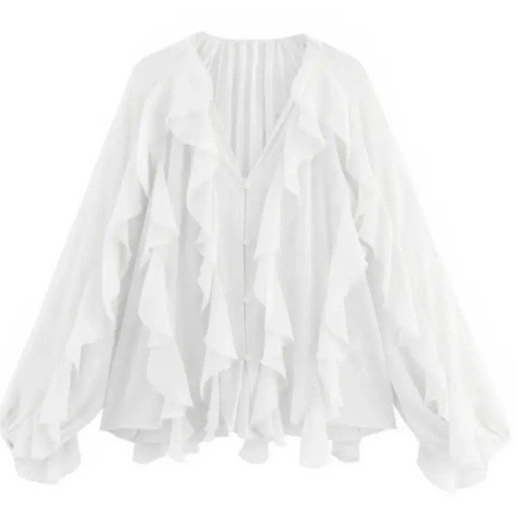 Chemise élégante pour femme à manches longues, volants et col en V offrant un style léger, confortable et intemporel adapté aux tenues quotidiennes et professionnelles. Description complète