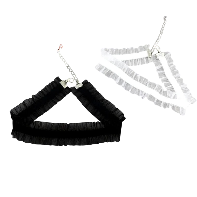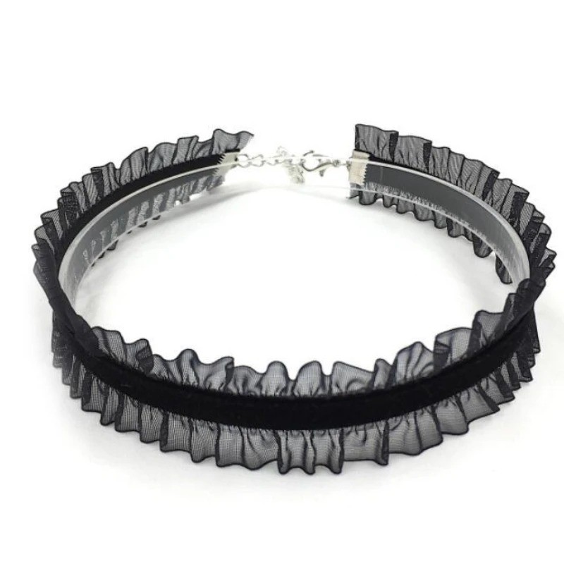 La combinaison de matériaux donne à l'accessoire une structure intéressante et un contraste visuel. La finition en dentelle est légère et décorative, tandis que l'élément en velours ajoute une profondeur subtile. Le choker pour femmes est conçu pour s'ajuster confortablement autour du cou tout en étant un détail marquant de la tenue. La dentelle crée un léger ourlet qui attire l'attention à un examen plus rapproché.
