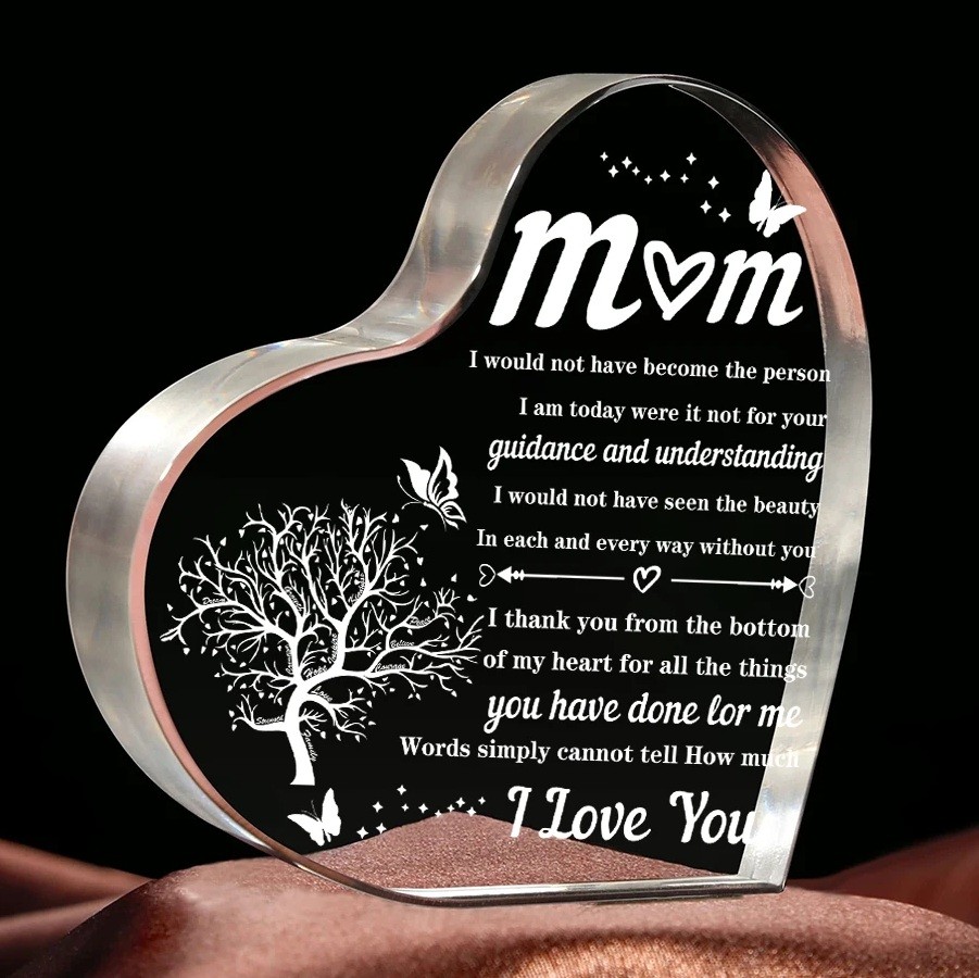 Cœur en acrylique Décoration transparente avec arbre de vie et texte pour maman Cadeau commémoratif élégant et luxueux d'anniversaire par amour