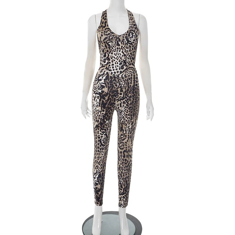 Stylée combinaison femme à motif léopard avec décolleté en V, tissu extensible et coupe confortable, idéale pour un usage quotidien ou en soirée. Description complète
