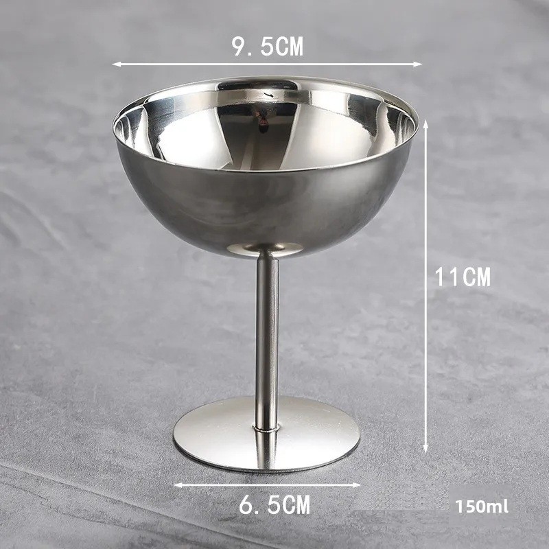 Bol à dessert en acier inoxydable sur pied élégant, idéal pour la glace et les douceurs. Dimensions 9,5 × 11 × 6,5 cm pour un service pratique. Description complète