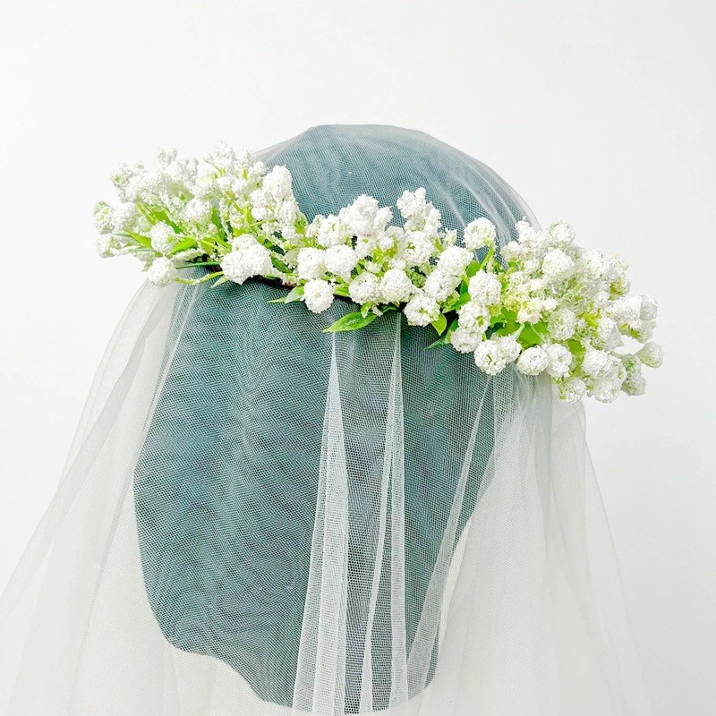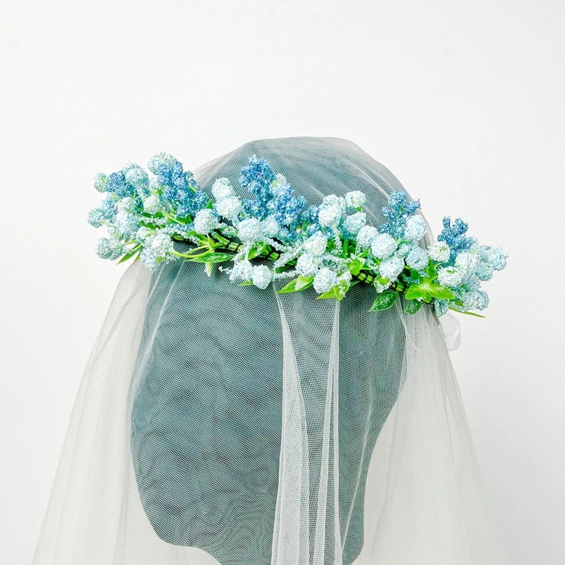 La couronne de fleurs des champs avec voile en tulle est l'accessoire idéal pour les mariées qui préfèrent un style doux et naturel. Les petites fleurs accompagnées de feuilles créent une composition légère et champêtre, qui paraît fraîche et romantique. Le voile en tulle fluide apporte de l'air à la coiffure et souligne l'atmosphère de mariage. Cette couronne de mariée naturelle est adaptée aux cérémonies en plein air, aux mariages rustiques et aux cérémonies intimes.