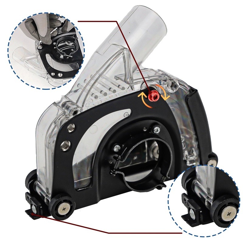 Ce couvercle de protection pour meuleuse d'angle est conçu pour une coupe propre, sûre et précise sans excès de poussière. Grâce à un orifice d'aspiration efficace qui peut être facilement connecté à des aspirateurs d'atelier courants, la poussière est immédiatement évacuée, améliorant ainsi la visibilité et le confort de travail. La partie avant transparente du couvercle assure un contrôle sur l'ensemble du processus de travail et permet de mieux suivre la ligne de coupe. La profondeur de coupe réglable offre un réglage précis en fonction du type de matériau, qu'il s'agisse de béton, de briques, de carreaux ou d'autres surfaces dures. Les roulettes de guidage au bas du couvercle aident à maintenir un mouvement fluide et droit, augmentant ainsi la précision et réduisant l'effort lors du travail.
