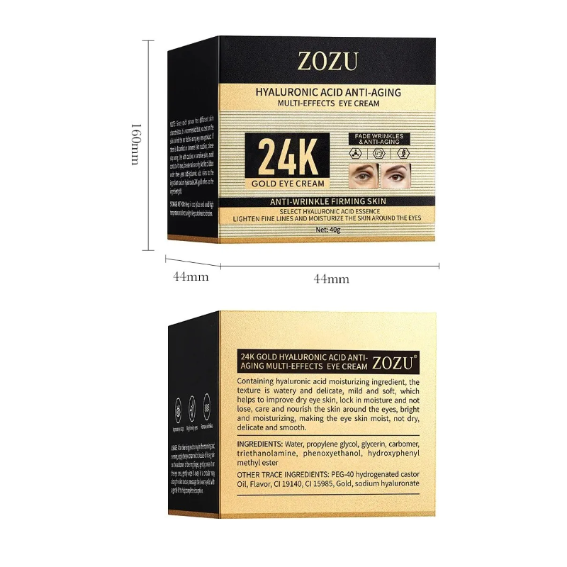 Crème contour des yeux anti-rides 40 g à l'acide hyaluronique et à l’or Hydratation Éclaircissement Raffermissement de la peau Réduction des gonflements