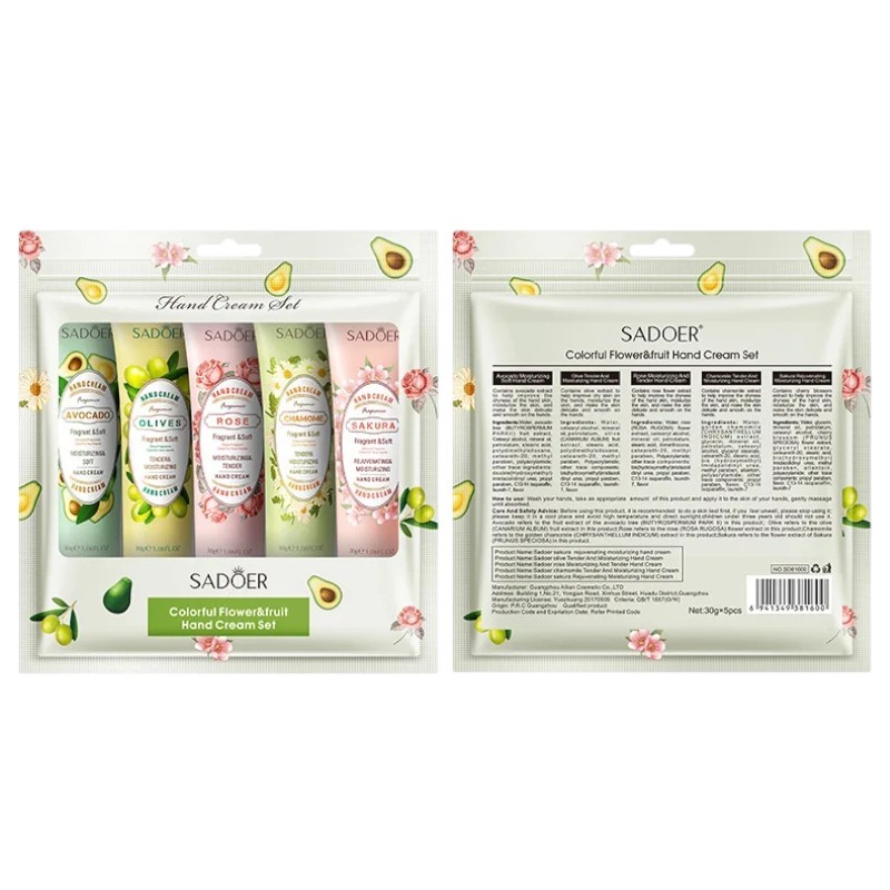 Crème hydratante pour les mains 30 g Ensemble de 5 pcs Crème nourrissante parfumée contre le dessèchement Avocat Rose Camomille Sakura Huiles