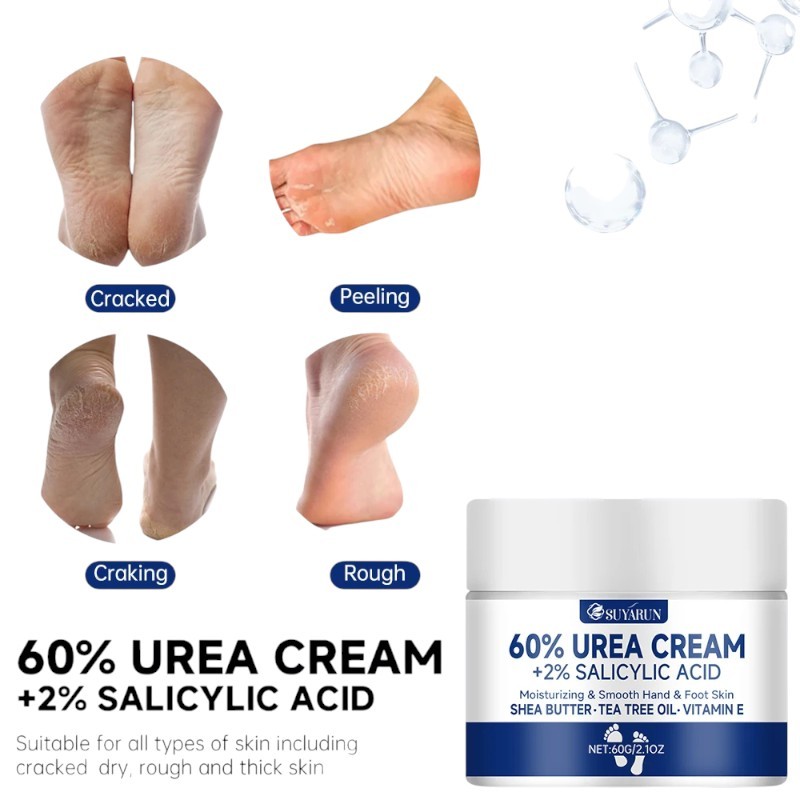 Crème hydratante pour les pieds et les mains 60 g 60 % urée 2 % acide salicylique 4,9 x 4,3 cm Beurre de karité Huile d'arbre à thé Vitamine E
